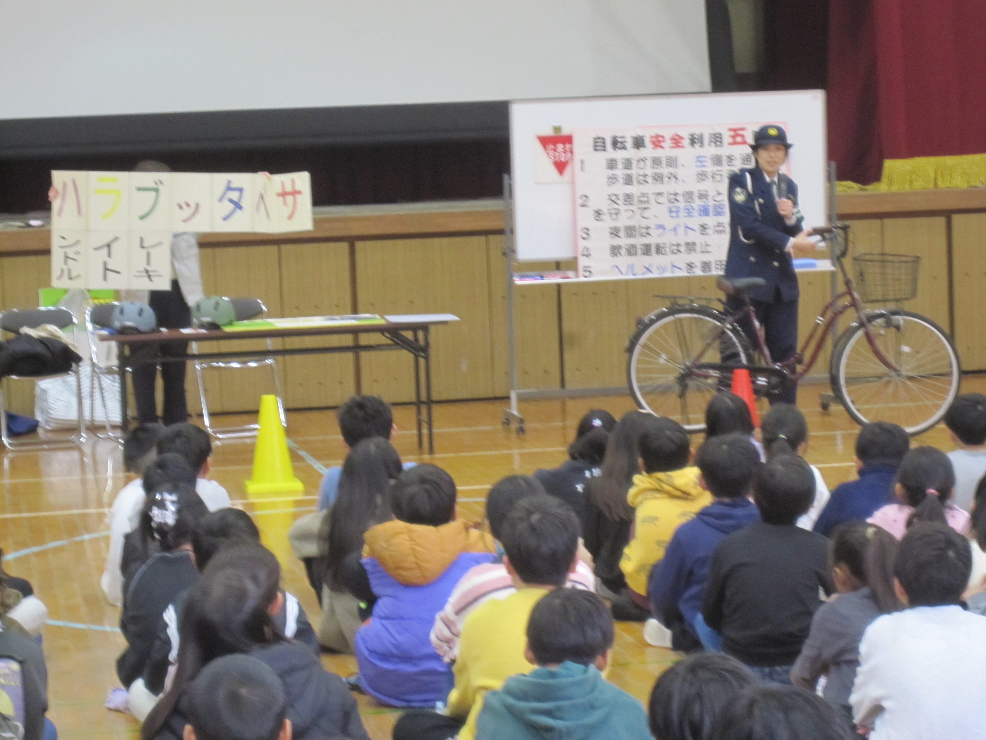 1/20 交通安全教室(3、4年)岸和田警察の方にお越しいただき、自転車の乗り方や交通ルールについて学びました。自転車点検の合言葉「ハラブッタベサ」子どもたちに聞いてみてください。