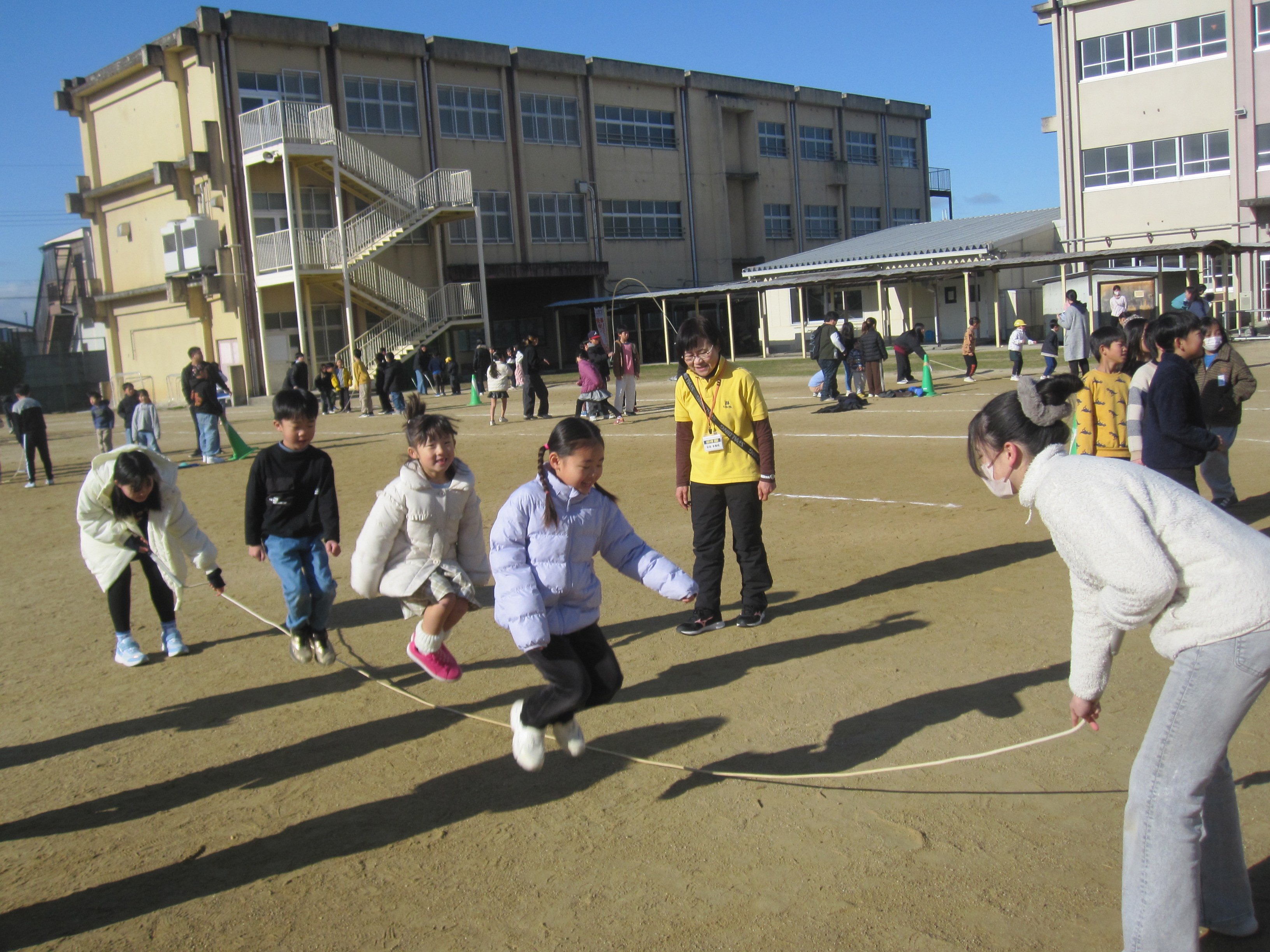 1/21 たてわりなわとび大会 たてわり班別の大繩大会です。天気予報では大寒波でした。が、北風もなく日光が降り注ぐ絶好のコンディションのなか、気づけば次々に上着を脱ぎだす子どもたち。優しく縄を回す6年生の姿も印象に残りました。